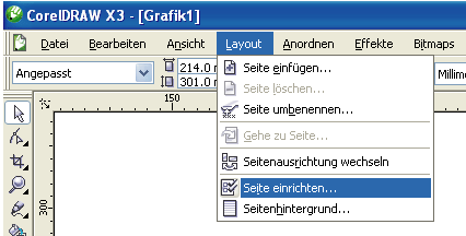 Legen Sie nach unseren Beschnittvorgaben einen Rahmen innerhalb des Papierformats an. Dazu gehen Sie auf den Menüpunkt „Layout“ und „Seite einrichten...“.