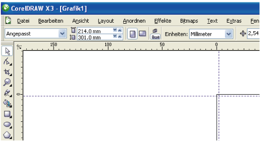 Ziehen Sie nun aus waagerechter und senkrechter Linealleiste jeweils eine Hilfslinie über die Zeichenfläche zum Beschnitt, der für das Format festgelegt ist.
