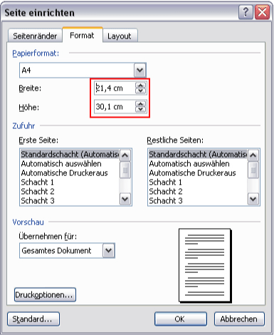 Es öffnet sich ein neues Fenster indem Sie ihr Papierformat auswählen können. Geben Sie hier Ihre gewünschten Maße (inklusive Beschnitt) ein und bestätigen Sie.
