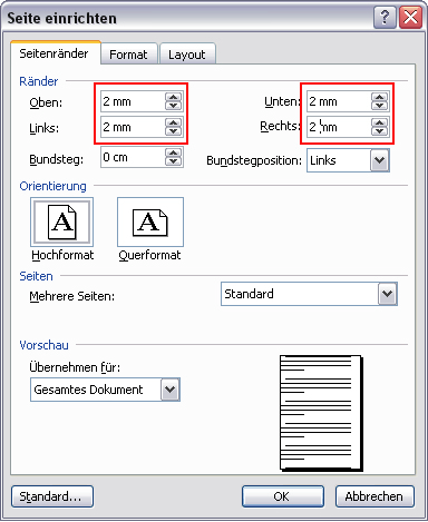 Gehen Sie nun auf den Reiter „Seitenränder“ und geben Sie für jede Seite, sowie unten und oben den Beschnitt ein. Achten Sie hierbei, auf die von Ihnen gewählte Einheit! Bestätigen Sie.